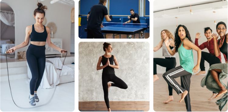 Latihan sederhana seperti plank, squat, push-up, dan skipping dapat dilakukan tanpa alat. HIIT juga efektif dilakukan dalam waktu singkat. Tenis meja dan biliar menjadi alternatif aktivitas ringan yang tetap menjaga tubuh aktif.